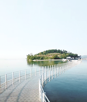 여수 가볼만한곳으로 예술의 섬 장도는 진섬 대교를 건너야 해요. 조수에 따라 다리가 잠길 수 있으므로 방문 전 조수를 확인해야 해요. 1시간 정도면 둘러보고 나올 수 있는 작은 섬이지만 산책하기 좋은 곳이에요. 갤러리와 예술가들의 창작 공간이 제공되는 곳이에요. 산책로를 따라 걷다보면 전망대 사진을 찍기에 적당한 구조물이 있어 푸른 겨울 바다의 풍경을 감상할 수 있어요.